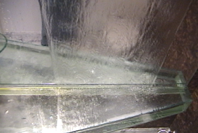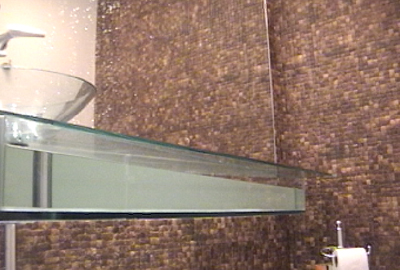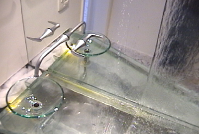 Fonte para lavabo com queda d'água sobre espelho um aquário substitui a tradicional bancada de mármore |